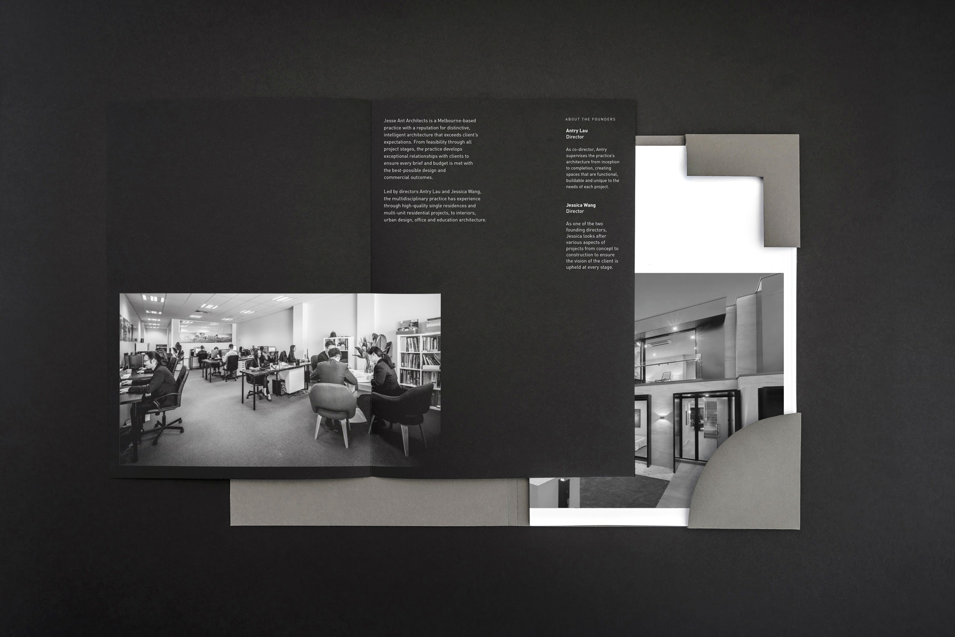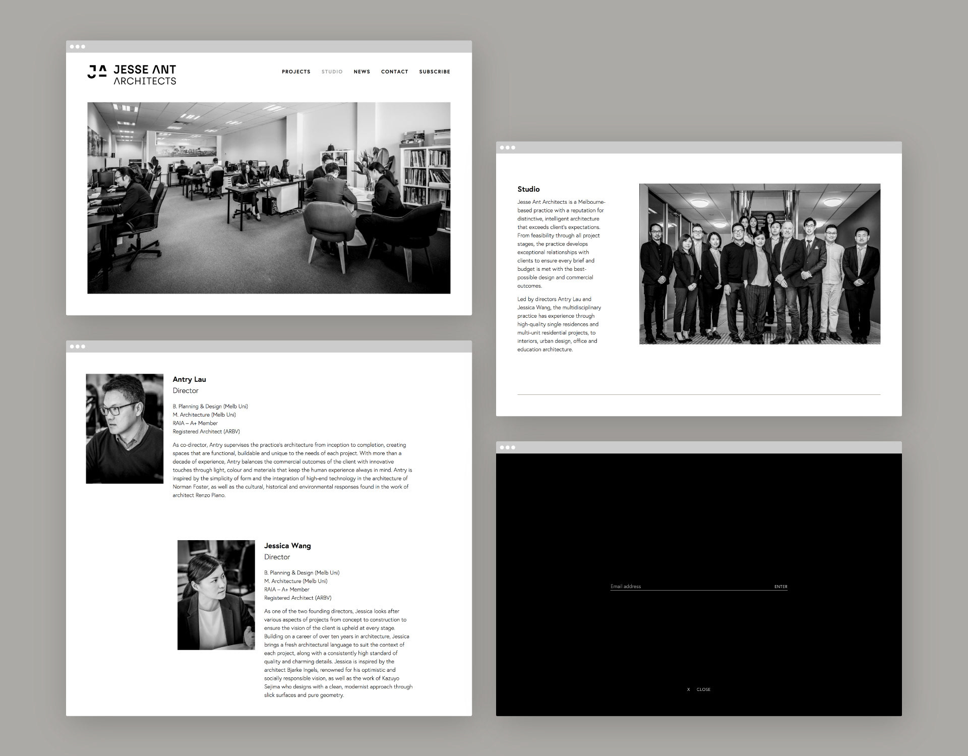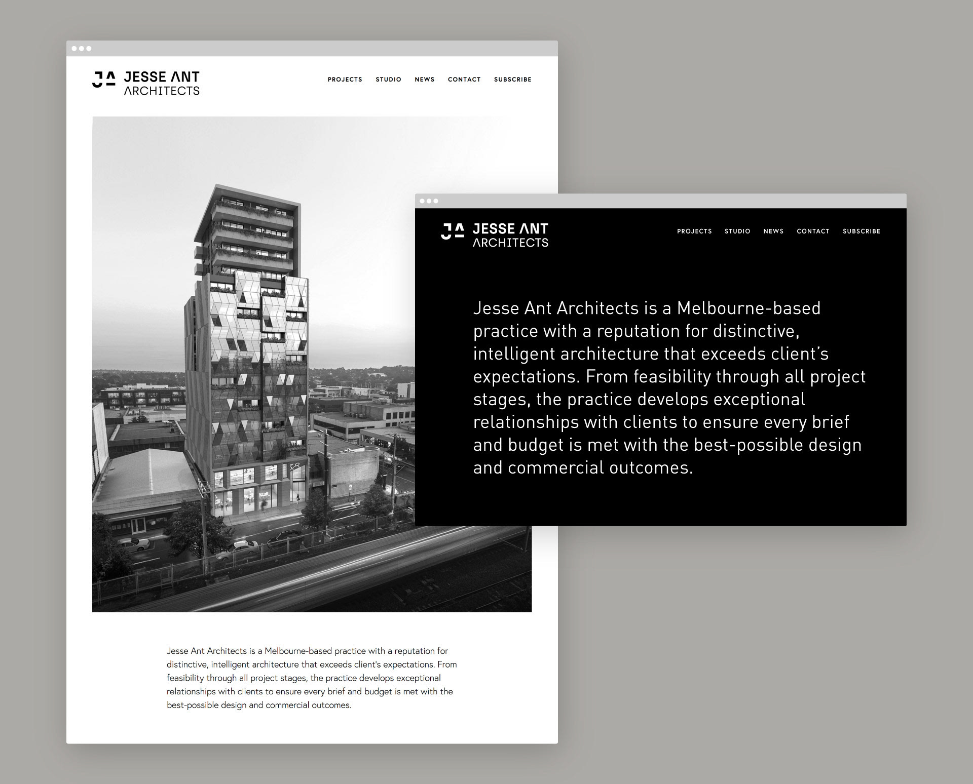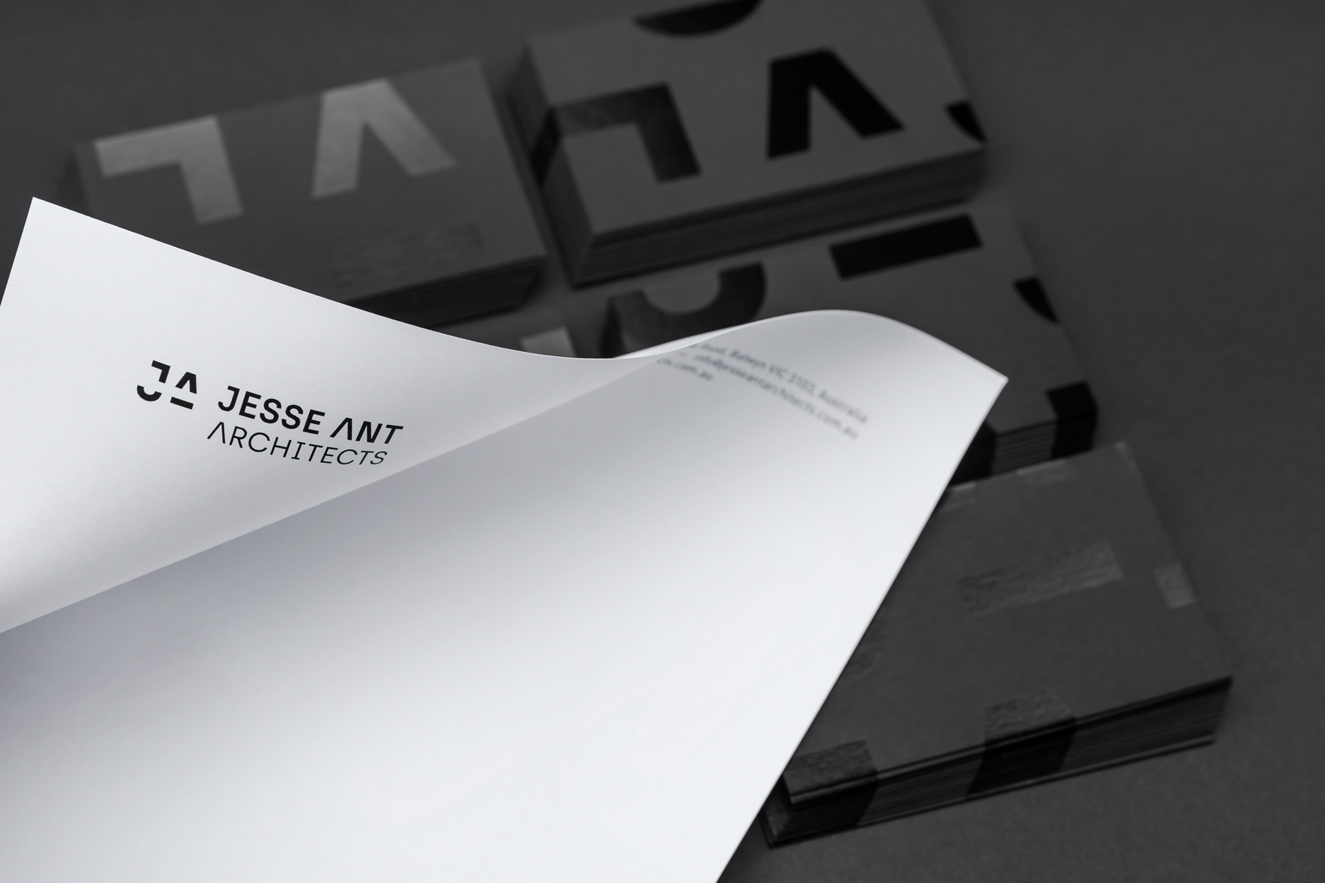Design de identidade de marca para Jesse Ant Architects, um escritório de arquitetura multidisciplinar com sede em Melbourne. Entregamos uma atualização da marca, um conjunto de materiais impressos e toda interface do novo site.