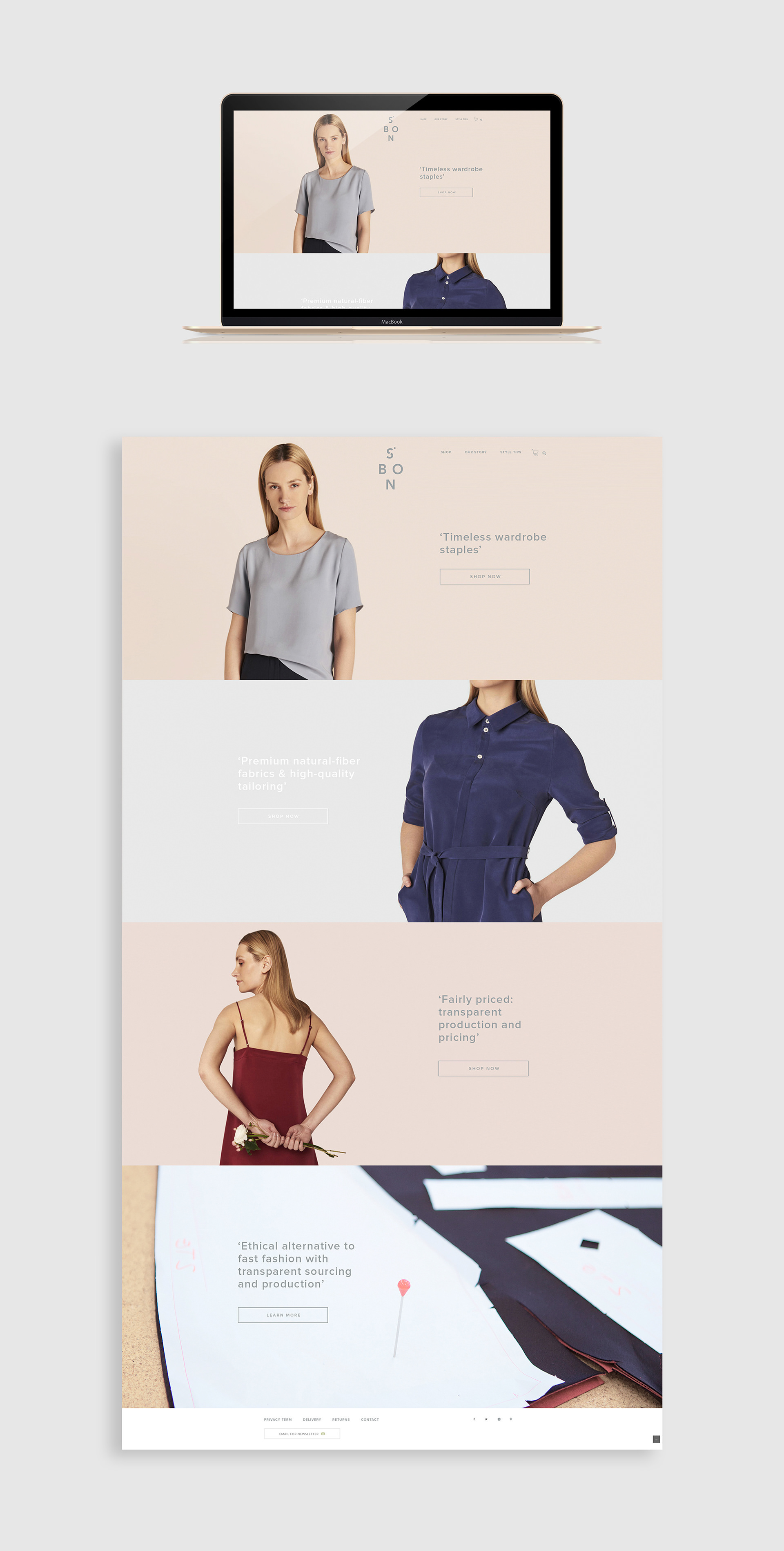 A S.Bon é uma marca feminina, minimalista e moderna. Suas roupas são para mulheres modernas que querem parecer chiques sem esforço, preferem qualidade a quantidade e importam-se com a procedência de suas roupas. Entregamos marca, um conjunto de materiais gráficos/impressos e toda interface do novo site.